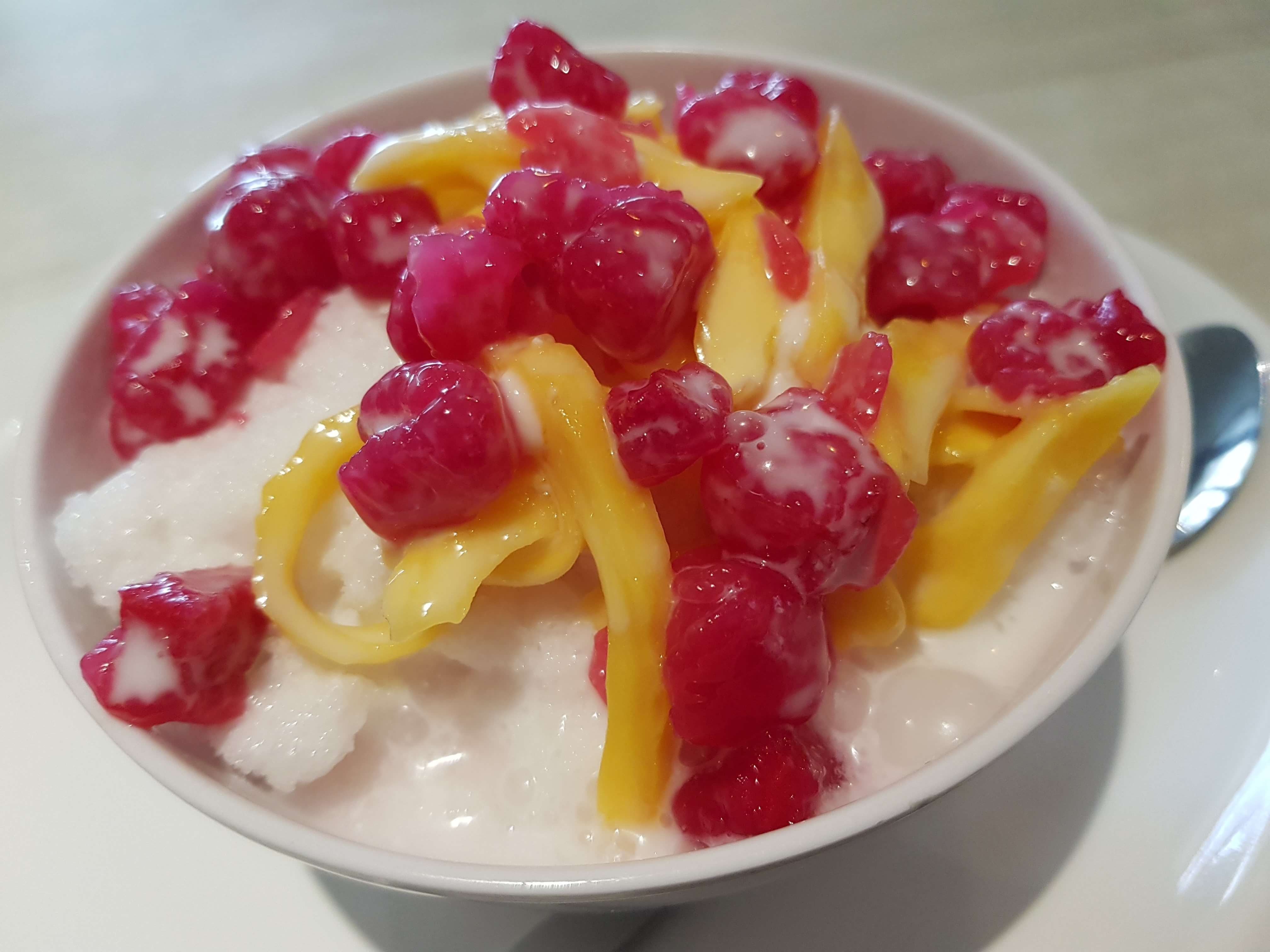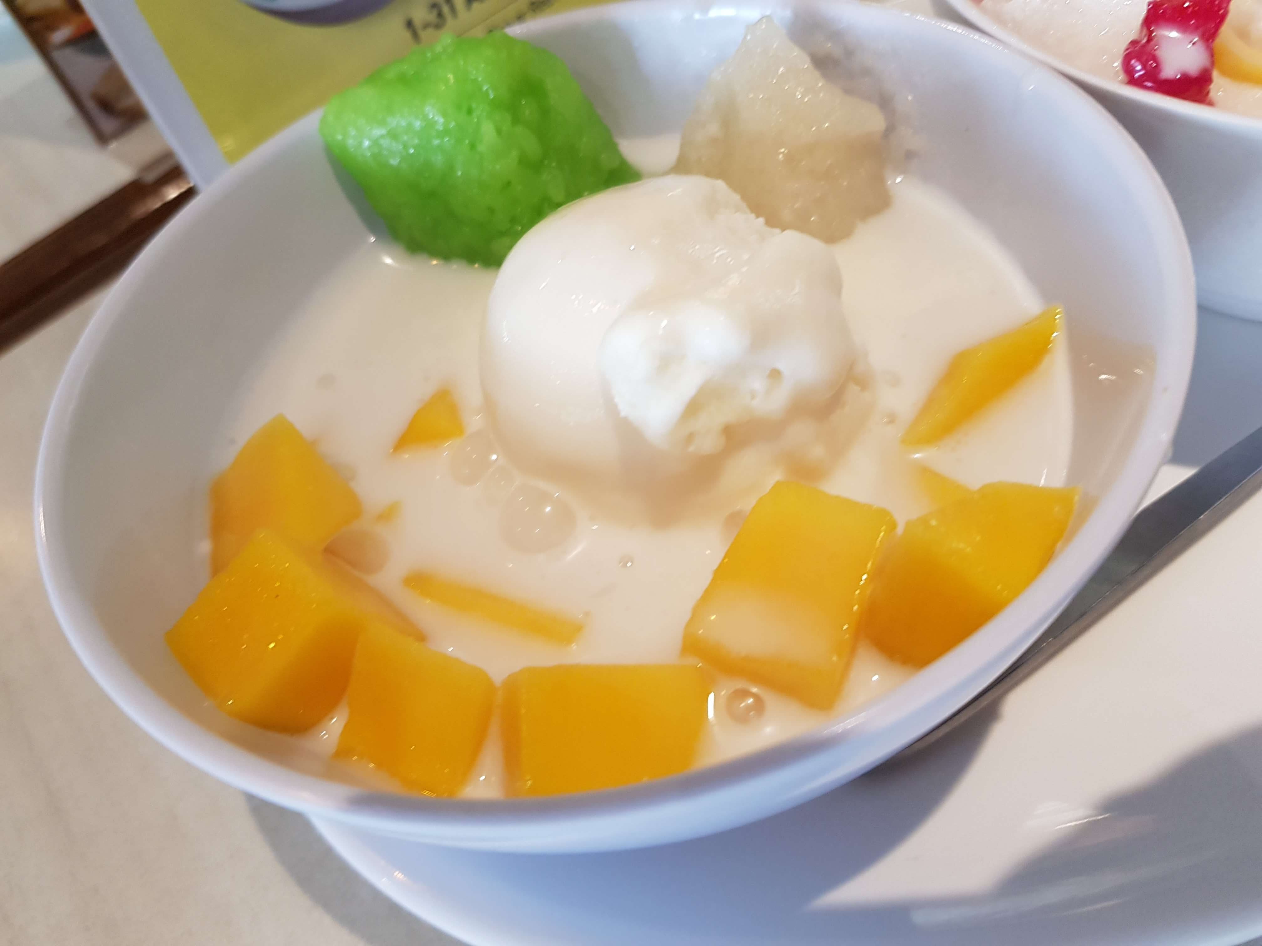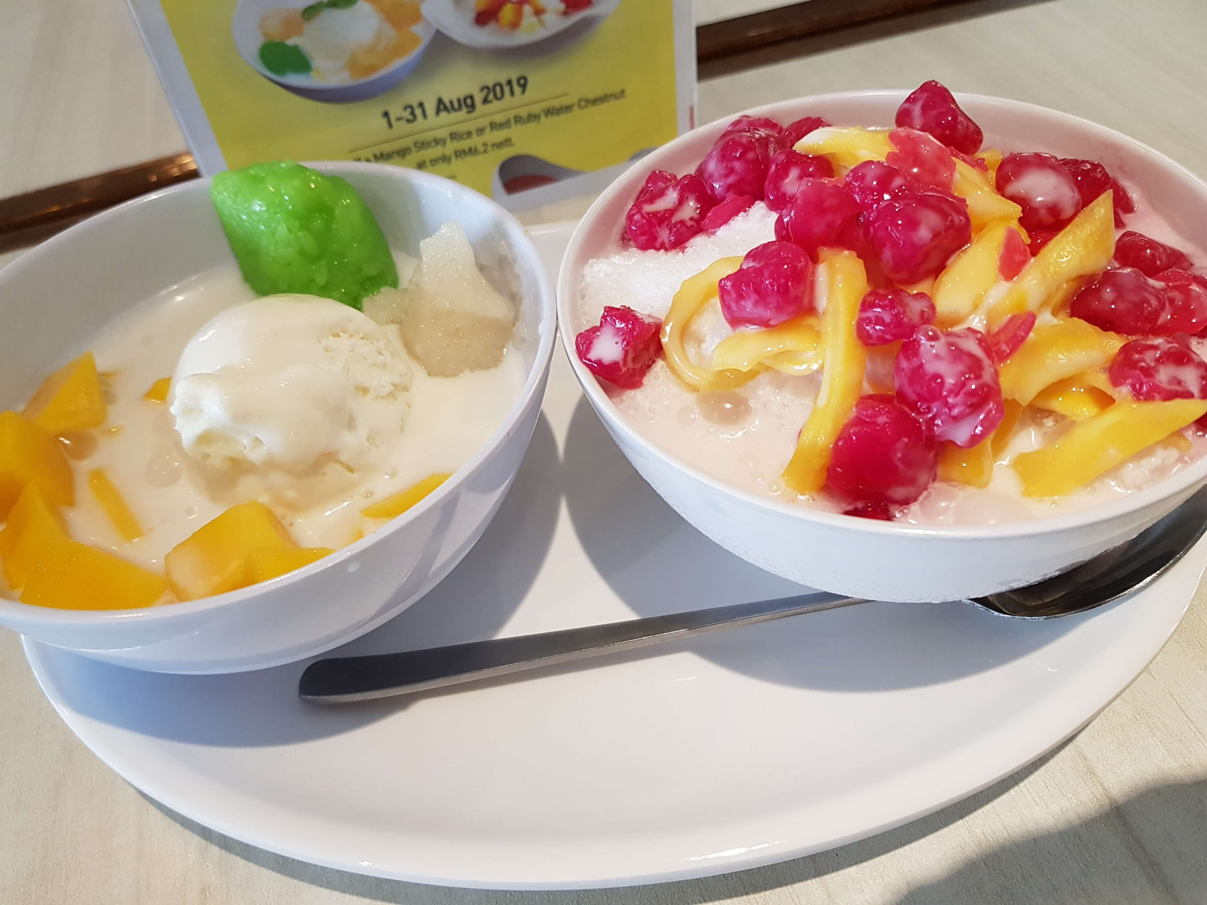 Penggemar pulut mangga cuba yang ini. Kelainan pulut warna putih dan hijau . Ditambah dengan aiskrim. Jadi ada rasa masin, manis, dan masam (buah mangga)