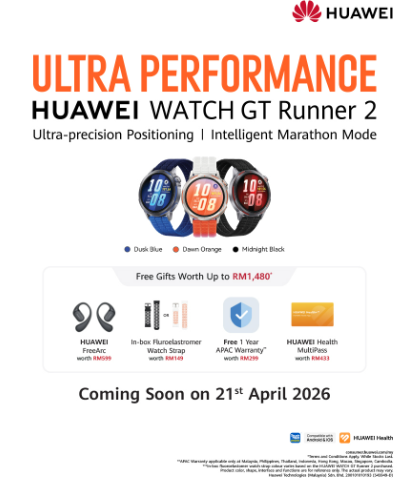 Available in three sky-inspired colors – Dawn Orange, Dusk Blue, and Midnight Black, the HUAWEI WATCH RUNNER 2 will be available for pre-order with complimentary gifts worth up to RM1,480, including the HUAWEI FreeArc, a 1-Year APAC Warranty, an in-box Fluoroelastomer Watch Strap, and HUAWEI Health MultiPass. These exclusive pre-order benefits are available through the HUAWEI Official Website, HUAWEI Official Store on Shopee, HUAWEI Flagship Store on Lazada, and the HUAWEI Official TikTok Shop.