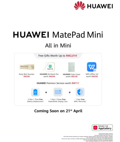Consumers who pre-order the HUAWEI MatePad Mini will receive complimentary gifts worth up to RM2,014, including an early bird voucher worth RM200, HUAWEI M-Pencil Pro, HUAWEI MatePad Mini Folio Cover, PC Level WPS 3.0, 3 Years 1 Time Free Battery Replacement, 1-Year 2 Times Free PaperMatte Display Care and a 1-Year Free APAC Warranty via any HUAWEI Experience Stores, the HUAWEI Official Website, HUAWEI Official Store on Shopee, HUAWEI Flagship Store on Lazada, and the HUAWEI Official TikTok Shop.