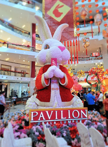 Until February 5, Pavilion KL’s Centre Court will be transformed into a spectacular oriental garden featuring golden rabbits, vibrant flowers, and hundreds of lanterns.