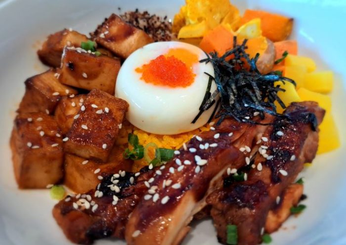 Teriyaki chicken thigh, quinoa calrose Japanese turmeric rice, poached omega egg, roasted veggies, tobiko fish roe, togarashi chili sprinkle, seaweed, takuan pickled radish, white sesame seed and teriyaki sauce