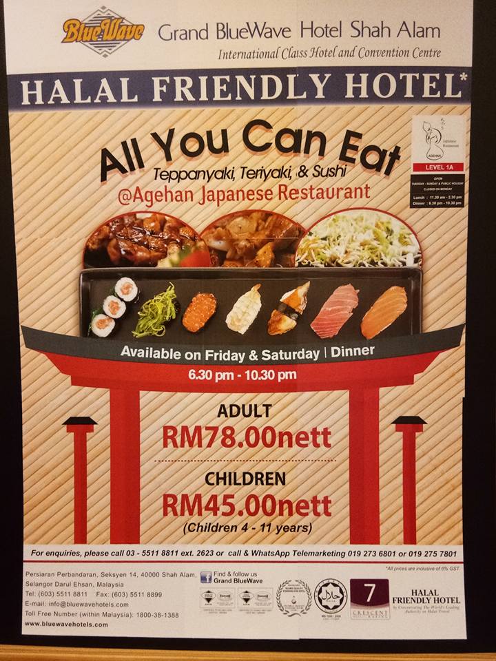 “All You Can Eat” kali ini di Agehan Japanese Rest menghidangkan semua jenis sushi, Temaki, Makimano, mee, teriyaki dan teppayaki. Buffet kali ini khas untuk malam Jumaat dan Sabtu sahaja. Bermula dari jam 6.30 petang sehingga 10.30 malam. Untuk dewasa dari RM78.00 dan kanak -kanak berumur ( 4hingga 11 tahun) RM 45.00