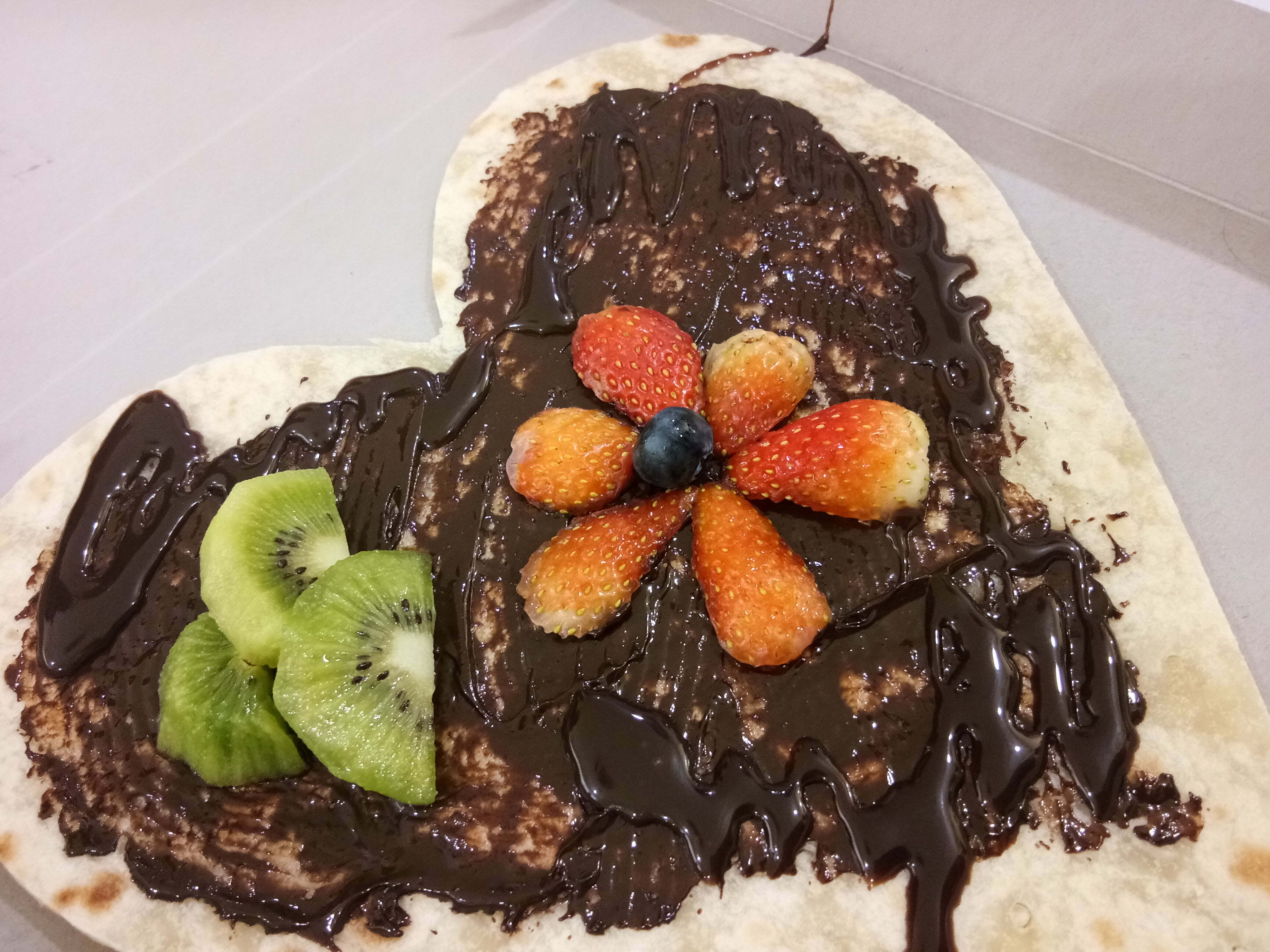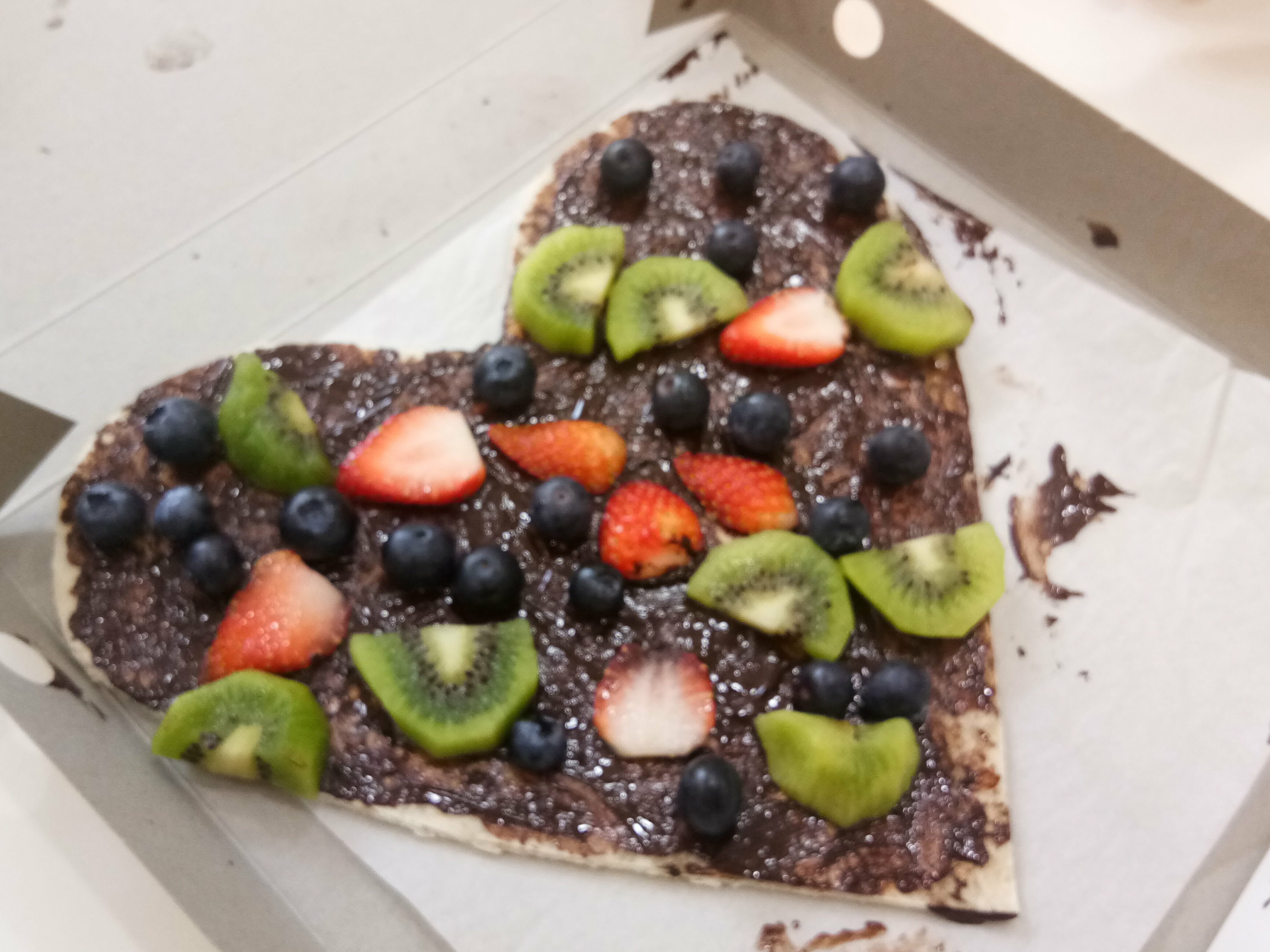Dengan buah-buahan segar seperti strawberi. kiwi dan blueberi. ‘Base’ pizza pula di sapu atau salut dengan coklat Nutella