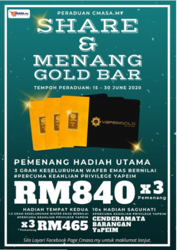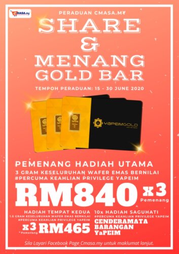 Jika anda ada membuat pembelian melalui https://cmasa.my/ ada berita baik tau! Hingga 30 June 2020 secara automatik anda boleh sertai Peraduan Kongsi dan Menang Gold Bar. Tapi ada cara-caranya ye.