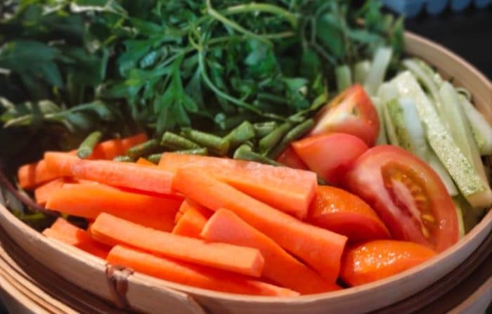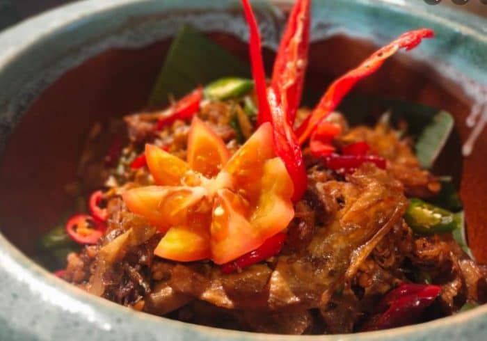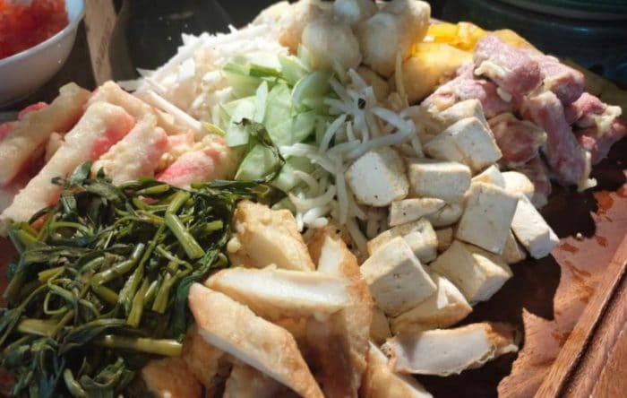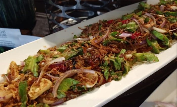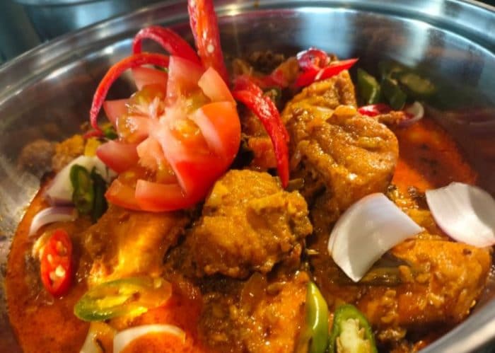 Nasi Hujan Panas – Ikan Tenggiri & Bendi dalam Kuah Assam – Gulai Daging Kawah dengan Kentang – Ayam Masak Merah – Varuval Daging Kambing – Udang Goreng Kering Kantonis – Kari Dhalce dengan Mangga Muda – Sayur Campur Tumis dengan Daun Basik Thai