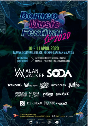 Borneo Music Festival Live 2020 Terbangkan Alan Walker ke Sarawak~Satu festival yang cukup istimewa dan eksklusif bakal mengegarkan peminat muzik dimana tidak lama lagi Borneo Music Festival Live 2020 bakal berlangsung di Sarawak Cultural Village pada 10 dan 11 April 2020 ini. Penganjuran yang dibawa khas oleh BME International ini merupakan hasil kerjasama antara Benta Mewah selaku penaja dan kolaborasi hebat diantara Firmament Event Studio Bersama More Entertainment.