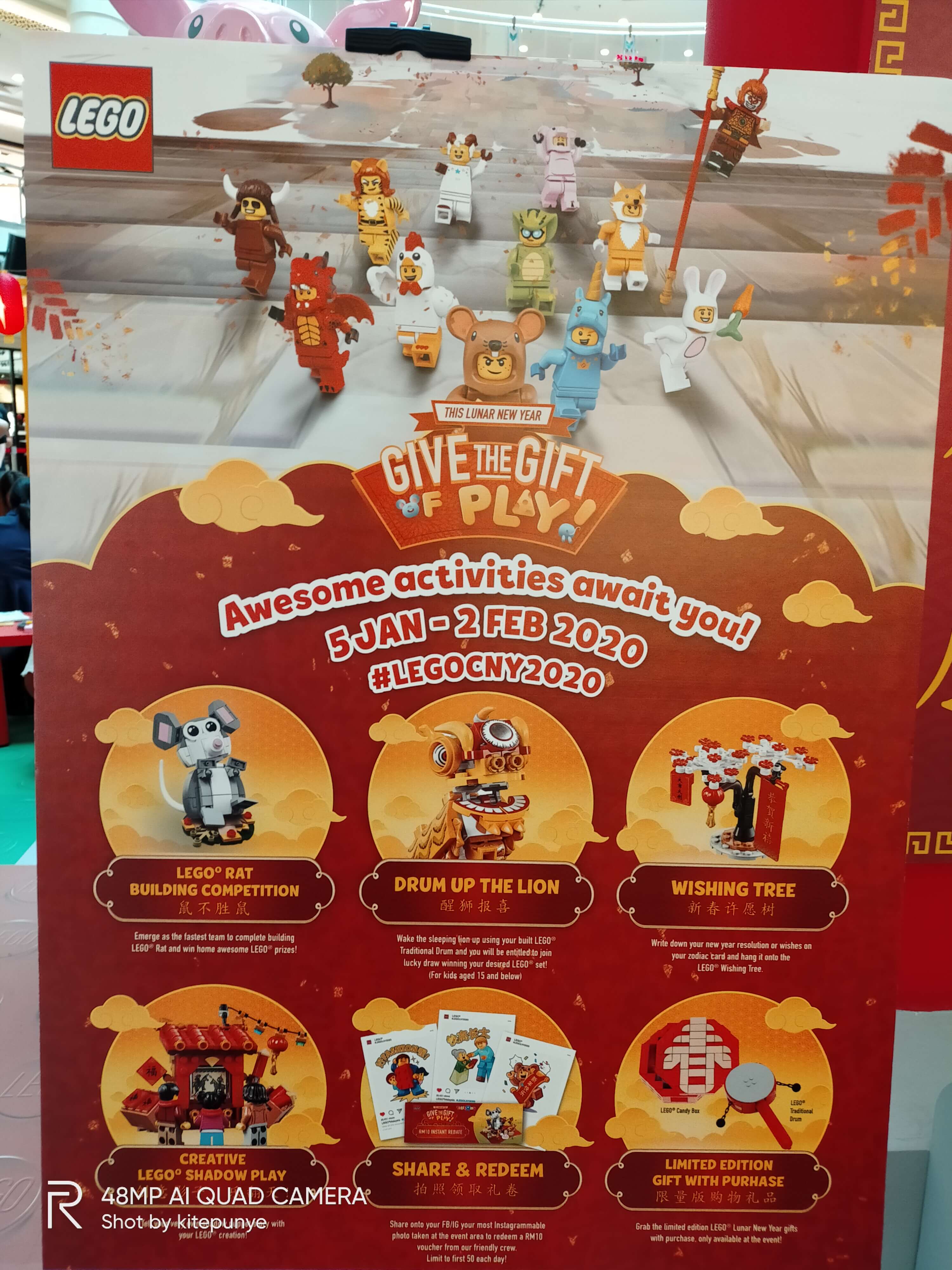Untuk kempen LNY 2020, LEGO® menawarkan dua promosi menarik di gedung. Dengan pembelian minimum RM68 mana-mana set permainan LEGO®, pelanggan boleh menebus paket Angpau Tahun Baru Cina 2020. Mereka yang berbelanja minimum RM238 (tidak termasuk set LNY) boleh menebus set edisi terhad LEGO® Year of the Rat.