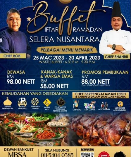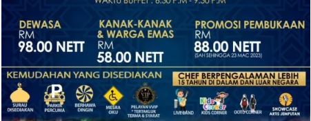 Tahun ini harga berbuka puasa adalah RM98.00 dewasa dan RM58.00 untuk warga emas dan kanak-kanak.