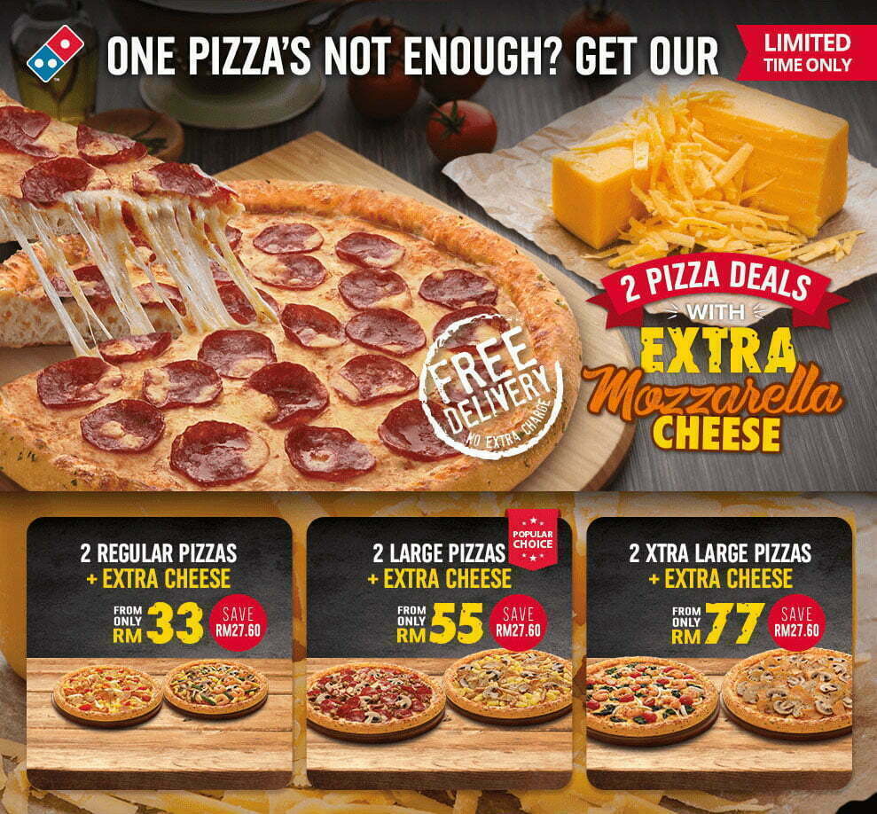 Pelanggan yang mengunjungi cawangan Domino’s juga boleh menikmati piza peribadi (Personal) tersebut pada harga RM4.90. Tambahan lagi, piza peribadi tersebut boleh ditambah saiznya kepada piza Biasa (Regular) pada harga RM6, piza Besar (Large) pada harga RM11 dan piza Ekstra Besar (Xtra Large) pada harga RM16 setiap Selasa sepanjang tempah kempen promosi Domino’s Super Tuesday. Tawaran ini sah untuk tiga (3) perasa piza popular iaitu Simply Cheese, Beef Pepperoni dan Aloha Chicken. Sementara itu, penggemar keju boleh menikmati toping keju tambahan menerusi pembelian dua piza biasa pada harga RM33, dua piza besar pada harga RM55 dan dua piza ekstra besar pada harga RM77, semuanya dengan lebih banyak keju mozarela