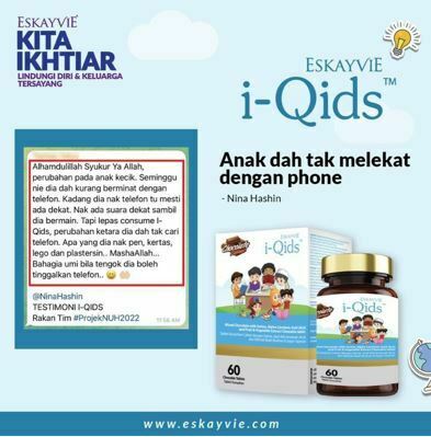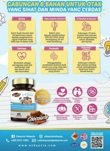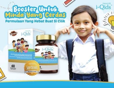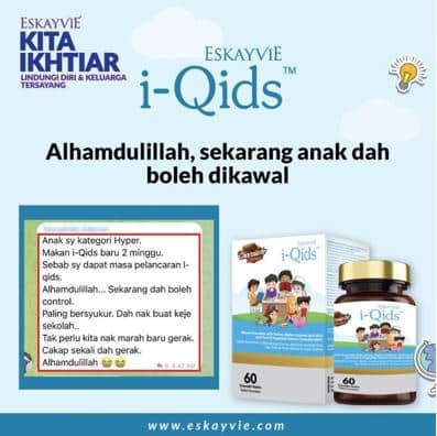 Korang yang masih lagi tercari-cari suplemen tambahan untuk diberikan kepada anak untuk perkembangan otak dan minda mereka, apa kata cuba Eskayvie i-Qids ni. Mana tahu dengan ikhtiar korang ni anak korang akan tunjukkan perubahan yang baik. Korang juga yang gembira nanti kan? Heee….