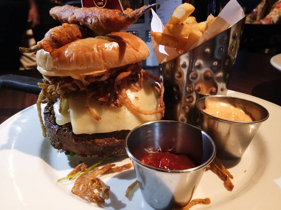 - Java Lava Burger – Beef patty grilled and dressed in a house-made espresso rub and topped with lava sauce, crunchy java onions, bacon, melted Cheddar cheese and garnished with a fried jalapeño.