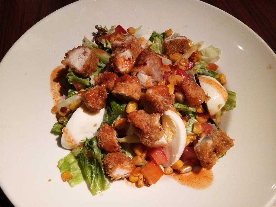 - Southern Salad – Fresh field greens and kale tossed in a vinaigrette with vine-ripened tomatoes, turkey bacon, roasted corn, pecans and hard-boiled egg. Topped with Southern fried chicken, and a tangy barbeque drizzle.