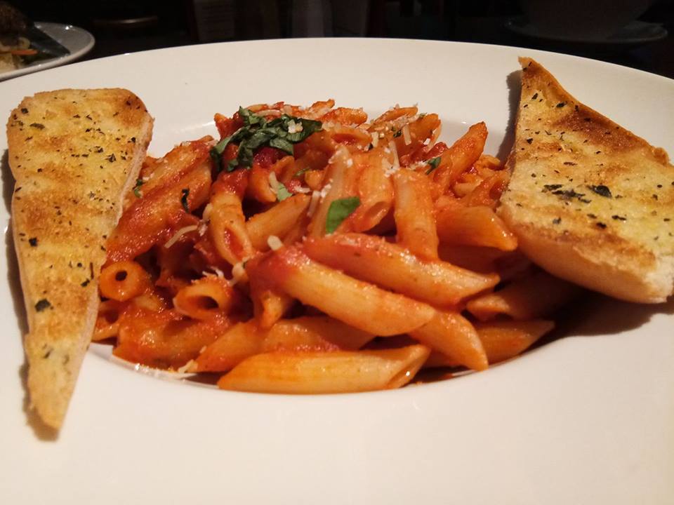 - Pasta Arrabiata – Penne pasta tossed with a fiery fresh tomato and garlic sauce with seasonal vegetables, fresh chili and olive oil. Served with oregano, Parmesan cheese and garlic toast.