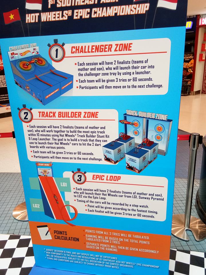 Hot Wheels® first Southeast Asia Epic Championship 2017 |The very first time in Hot Wheels® history, we bring together Hot Wheels® challengers from six (6) countries across Southeast Asia Epic Championship 2017 for an exciting championship to compete for the first Hot Wheels® Champion title and Hot Wheels prizes up to USD 2,000. Happening at LG2, Blue Concourse at Sunway Pyramid on the 21st October 2017, 12 little Hot Wheels® challengers aged 5-12 years old together with their moms are finalists representing their home countries and will compete for the 2017 HOT WHEELS® Southeast Asia Epic Championship 2017 title.