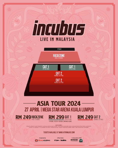 Jualan tiket konsert ‘Incubus Asia Tour 2024’ akan bermula pada 7 Disember 2024 pada pukul 12 tengah hari.