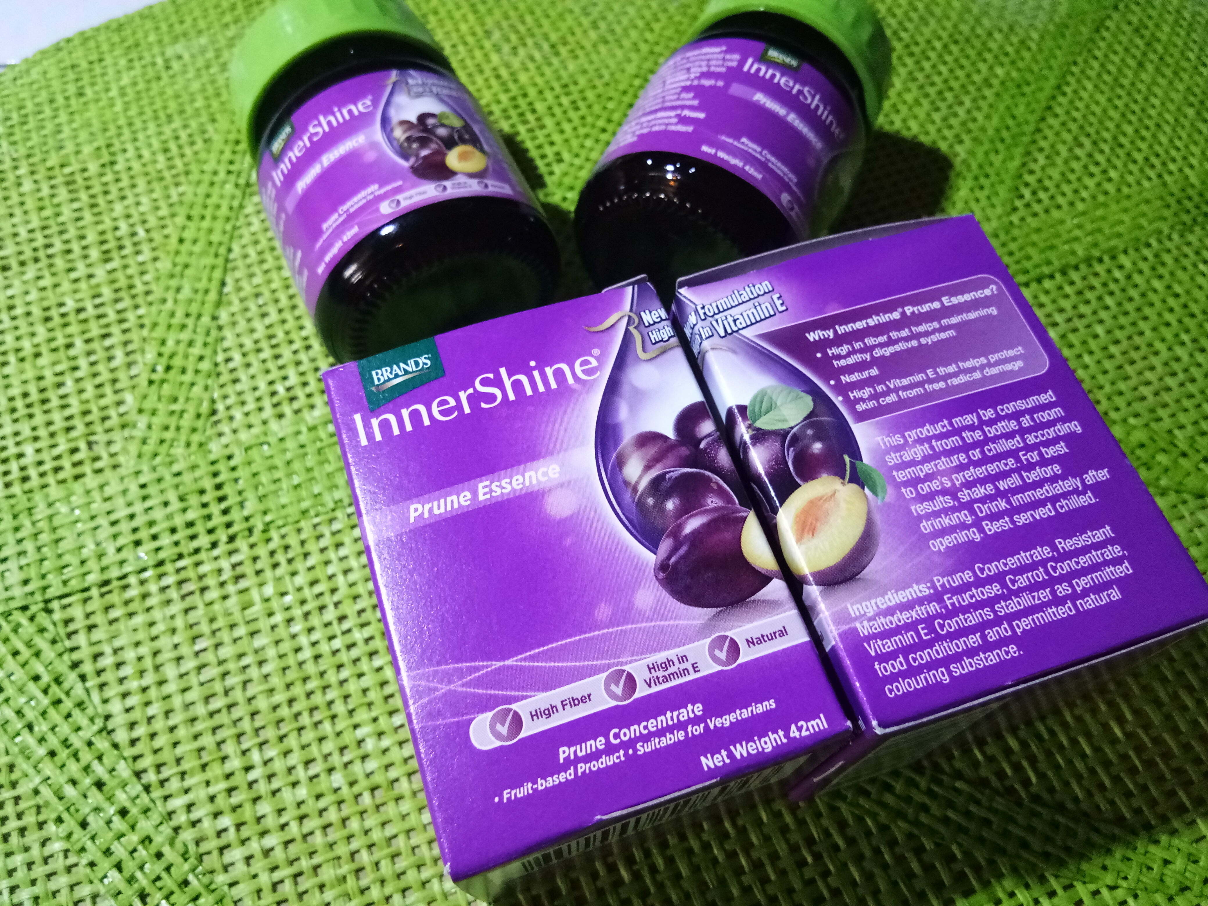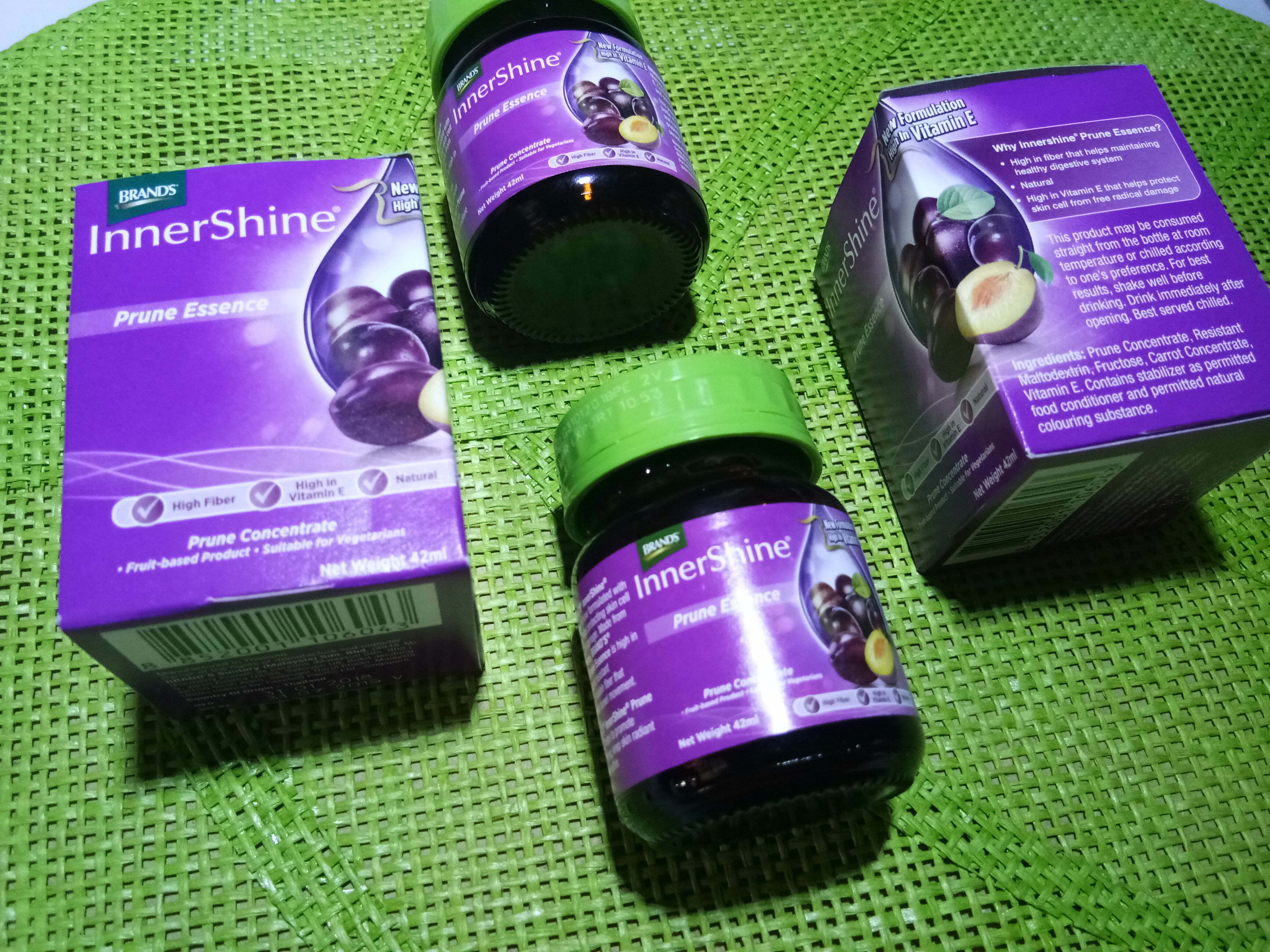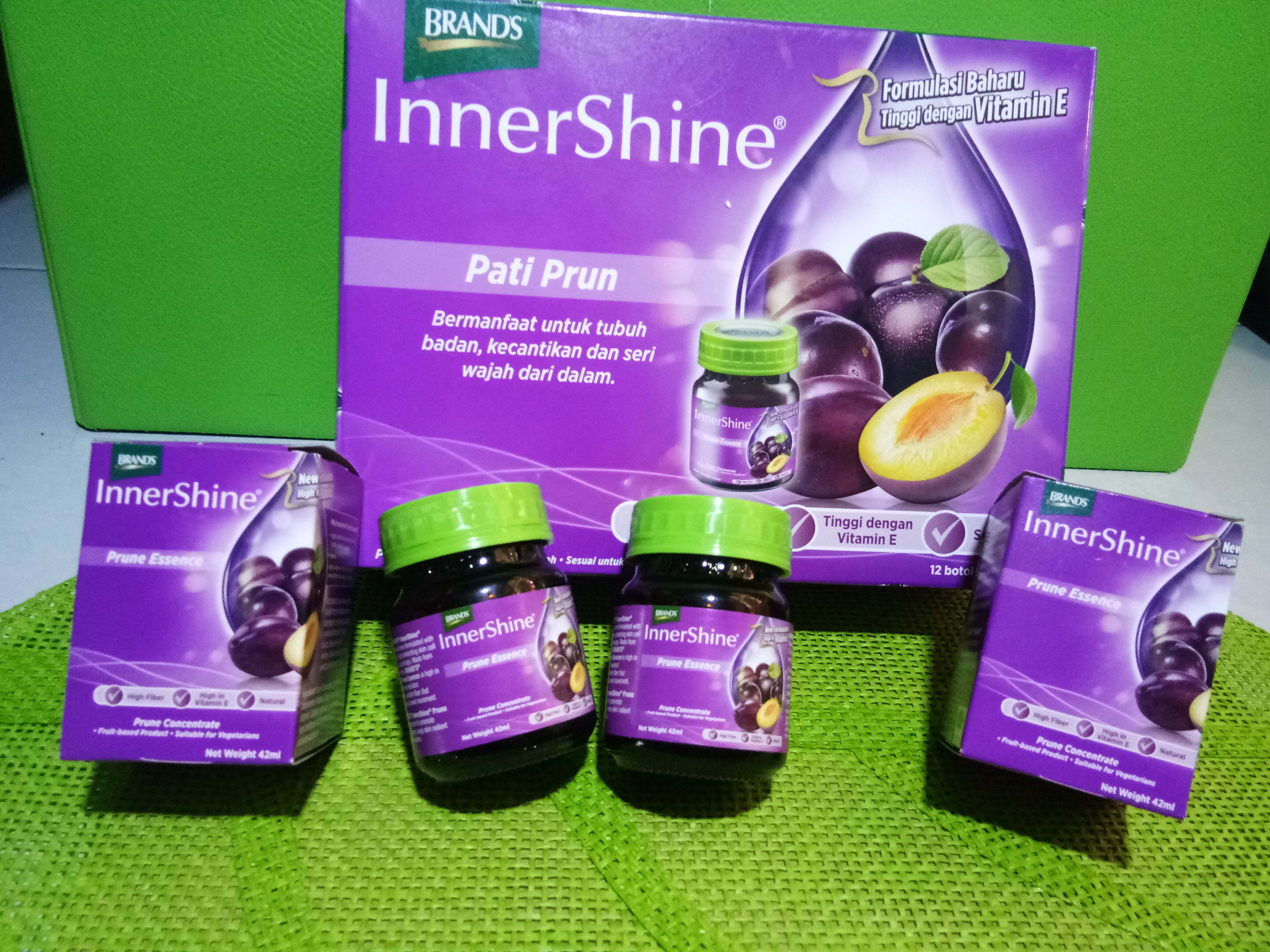 Formulasi terbaru BRAND’S® InnerShine® Prune Essence dengan Vitamin E mengandungi pati prun dengan tambahan Vitamin E bagi meningkatkan perlindungan kulit terhadap radikal bebas, sekaligus menjadikan kulit lebih sihat dan lebih berseri. Diperbuat dengan bahan semulajadi yang dipilih khas, BRAND’S® InnerShine® Prune Essence dengan Vitamin E yang 100% berasaskan buahan adalah produk yang disyorkan agar ditambah kepada rutin kecantikan seseorang, yang biasanya dimulakan dengan membersih dan melembap muka sebelum berakhir dengan melayang bedak atau solekan. Suplemen pemakanan ini kaya dengan gentian daripada prun dan maltodextrin perintang, sejenis gentian boleh larut yang menggalakkan kelancaran sistem pencernaan dan membantu menyingkir toksin tidak diingini daripada tubuh.