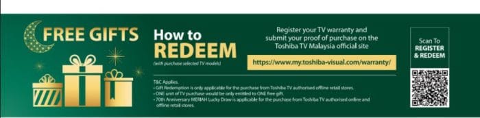 Customers can redeem the gifts simply by registering their TV warranty on Toshiba TV Malaysia’s official website.