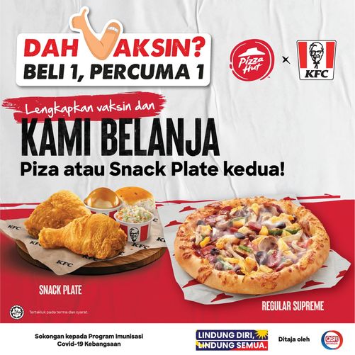 ‘Beli 1 Percuma 1’ memberi ganjaran kepada penerima lengkap vaksin COVID-19 dengan 1 hidangan KFC percuma berjumlah sehingga RM13.49 atau 1 hidangan hangat Pizza Hut percuma berjumlah sehingga RM29.90 dengan pembelian 1 hidangan. Untuk menebus, sila ikuti langkah-langkah di seperti berikut:
