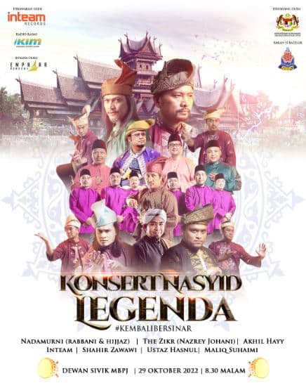 Konsert Nasyid Legenda akan diadakan pada 29 Oktober 2022 jam 8.00 malam di Dewan Sivik MBPJ di Petaling Jaya.