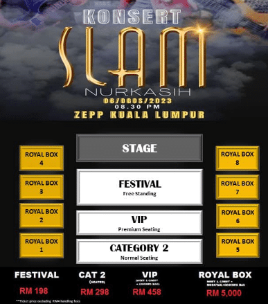 Tiket berharga RM198(festival), RM 298 (Cat 2 – kerusi), RM458 (VIP – kerusi & akan mendapat goodie bag serta meet and greet bersama SLAM ).