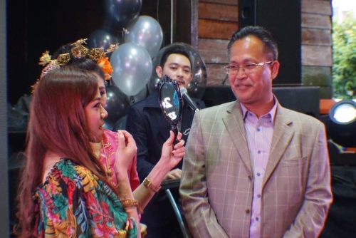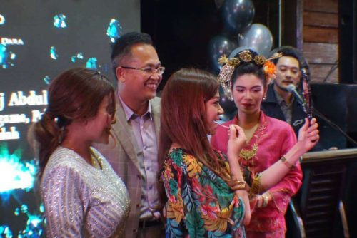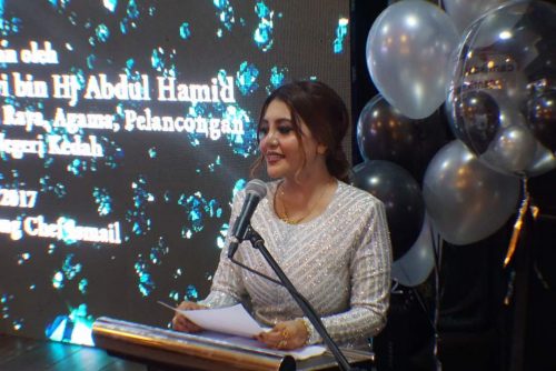Kelihatan Datuk Haji Mohd Rawi memberi produk Cantik Dara kepada Ruhainies sebagai tanda pelancaran produk Cantik Dara
