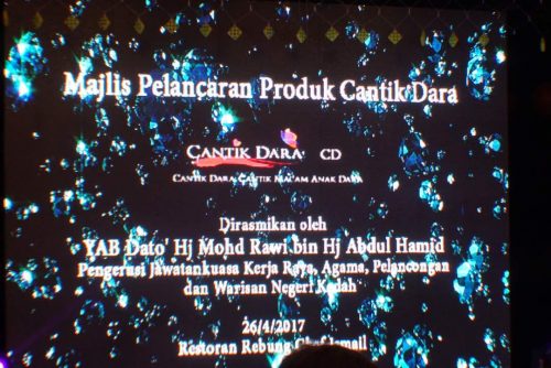 Pada hari yang sama telah berlangsungnya pelancaran produk Cantik Dara yang telah di rasmikan oleh Datuk Haji Mohd Rawi bin Hj Abdul Hamid iaitu Pengerusi JawatanKuasa Kerjaraya, Agama, Pelancongan, dan Warisan Negeri Kedah bersama Puan Nurul Sayang. Ruhainies, pelakon yang sedang meningkat naik telah di pilih secara rasmi menjadi jurucakap dan Duta Cantik Dara.