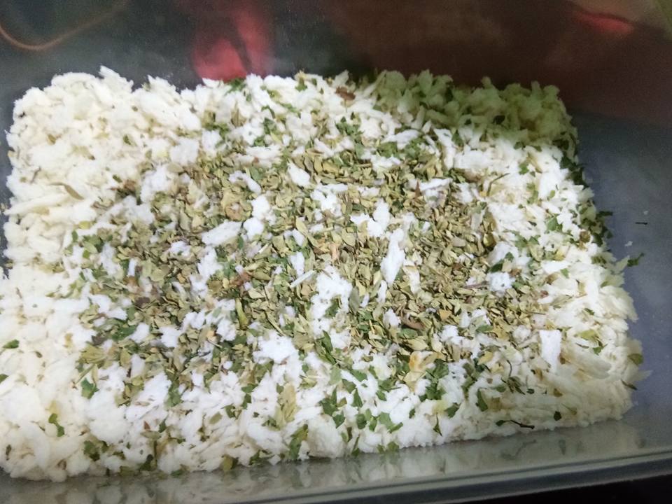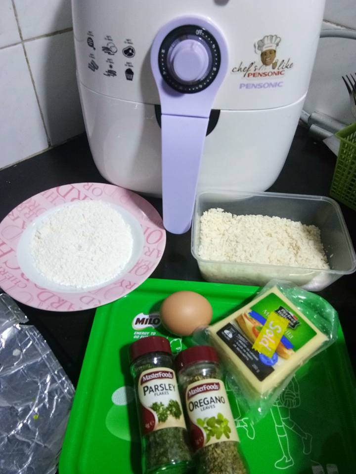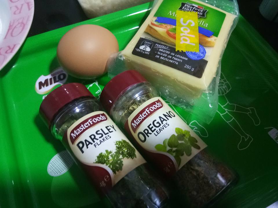 breadcumbs tadi di tambahkan sedikit oregano dan parsley . gaulkan rata.