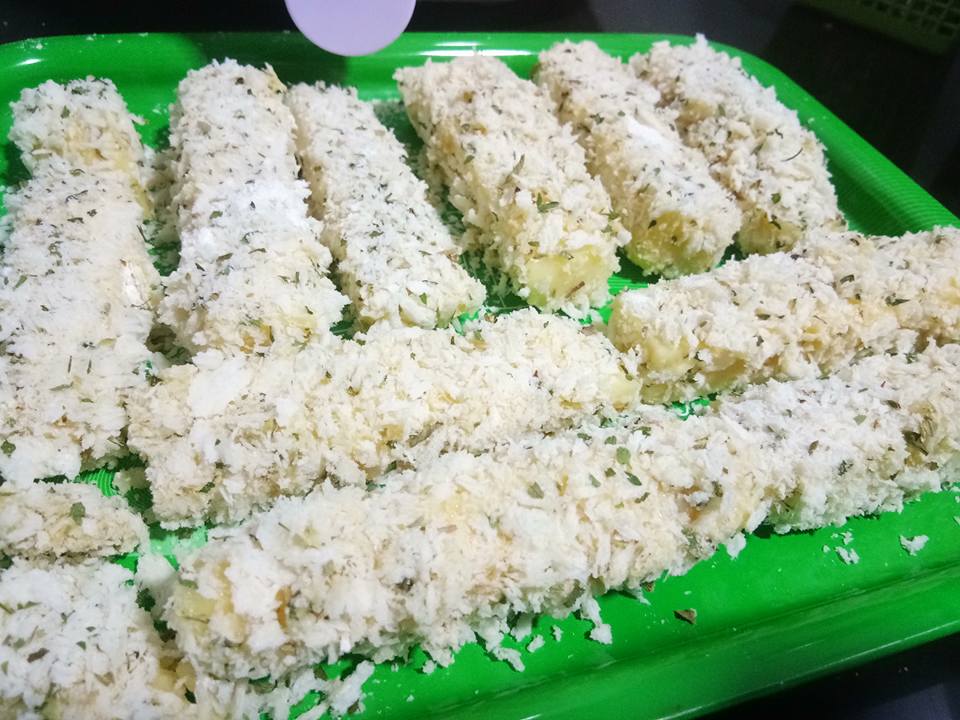 Kemudian mozarella yang dipotong di letak dalam tepung . pastikan semua bahagian rata – dicelup dalam telur rata dan akhir sekali di masukkan kedalam breadcrumbs. Apabila semua side sebati letakkan di dulang atau pinggan dan sejukkan untuk 10-15 minit