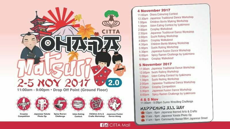 OHARA MATSURI 2.0 (おはら祭り) di CITTA MALL Mulai 2 Nov 17 | Apakah maksud Ohara Matsuri? Adakah ianya sebuah tarian, makanan, pakaian yang berasal dari negara mana? dari negara manakah asalnya Ohara Matsuri ini ? Dari segi perkataan rasanya dari Jepun . Dengar-dengar bakal diadakan di Citta Mall hujung minggu ini so apa kata jom kita usha nak !!!