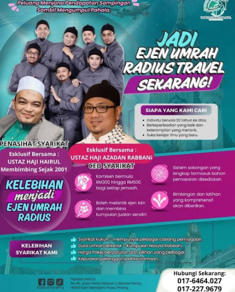 Melalui program istimewa ini, pihak Radius Worlwide Travel membuka peluang kepada individu individu yang berminat menjadi wakil jualan. Setiap wakil jualan akan dibimbing dengan bantuan dari sudut pengetahuan tentang industri umrah dan pelancongan. Insyallah mampu mendapat pendapatan tambahan dari mempromosikan pakej pakej umrah yang kami tawarkan.