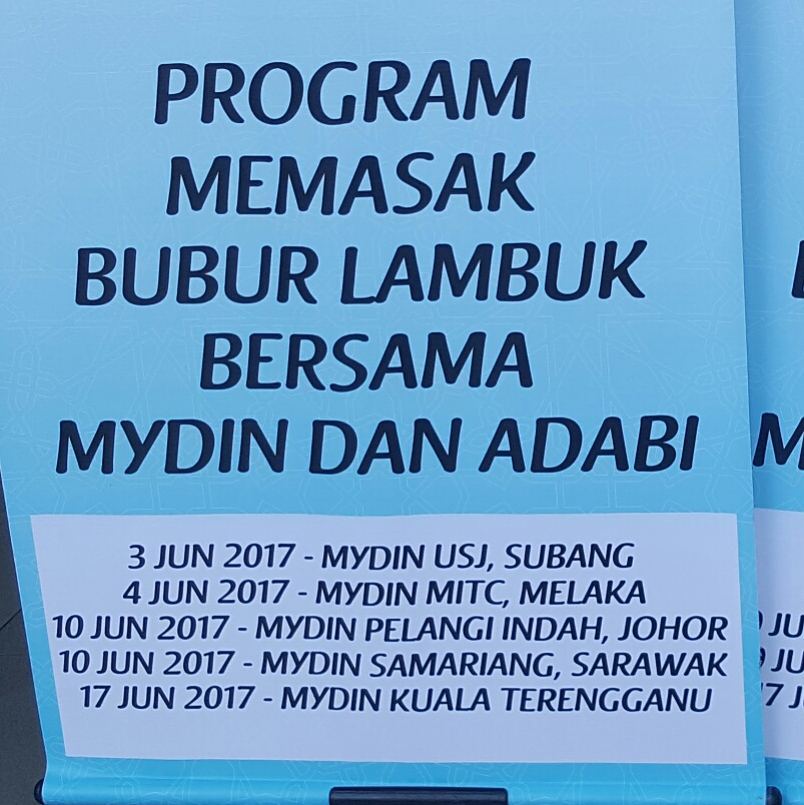 Bubur Lambuk ADABI untuk kali ini berkaloborasi diantara ADABI dan MYDIN sempena Ramadan 2017. Program bubur lambuk bukanlah pertama kali diadakan di MYDIN tetapi sudah bertahun-tahun. Untuk acara tahunan kali ini dijalankan bersama pihak ADABI sepanjang bulan Ramadan . ADABI juga mengambil peluang untuk bekerjasama dengan Mydin dan telah memilih 5 lokasi diantara MYDIN hypermarket yang ada di seluruh Malaysia. Program bubur lambuk ini juga adalah satu langkah yang bijak kerana ianya akan mengekalkan penjenamaan Adabi itu sendiri di kalangan masyarakat dan pengguna setia Adabi.