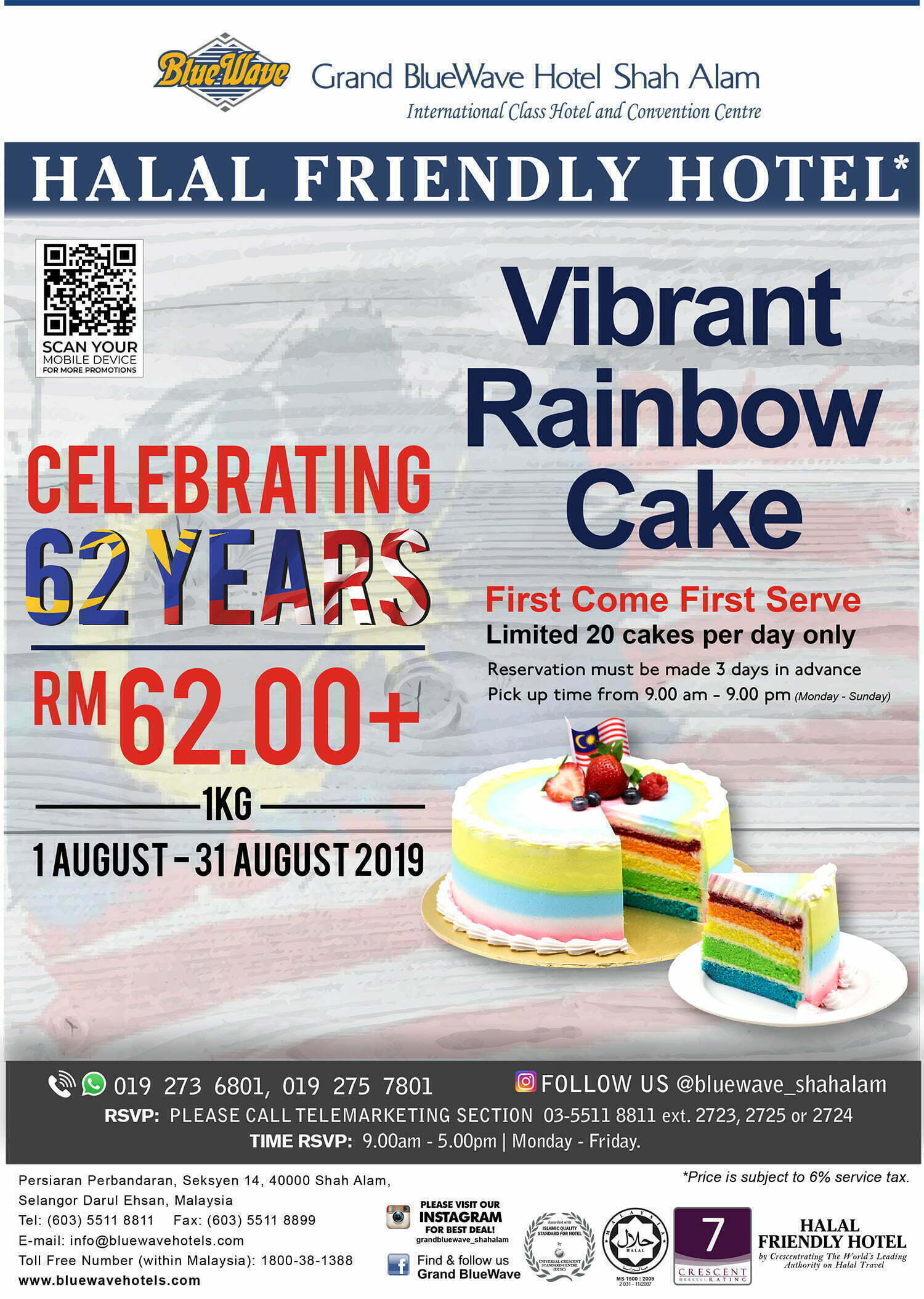 Untuk menambah lagi kemeriahan sambutan Kemerdekaan Malaysia yang ke 62 tahun, GBWHSA turut menawarkan promosi kek Vibrant Rainbow 1 KG dengan harga RM62.00+ terhad kepada 20 kek setiap hari dari 1 Ogos sehingga 31 Ogos 2019. Bagi mendapatkan promosi kek ini, pelanggan haruslah membuat tempahan kek dan pembayaran 3 hari sebelum tarikh mengambil kek melalui pegawai telepemasaran kami.