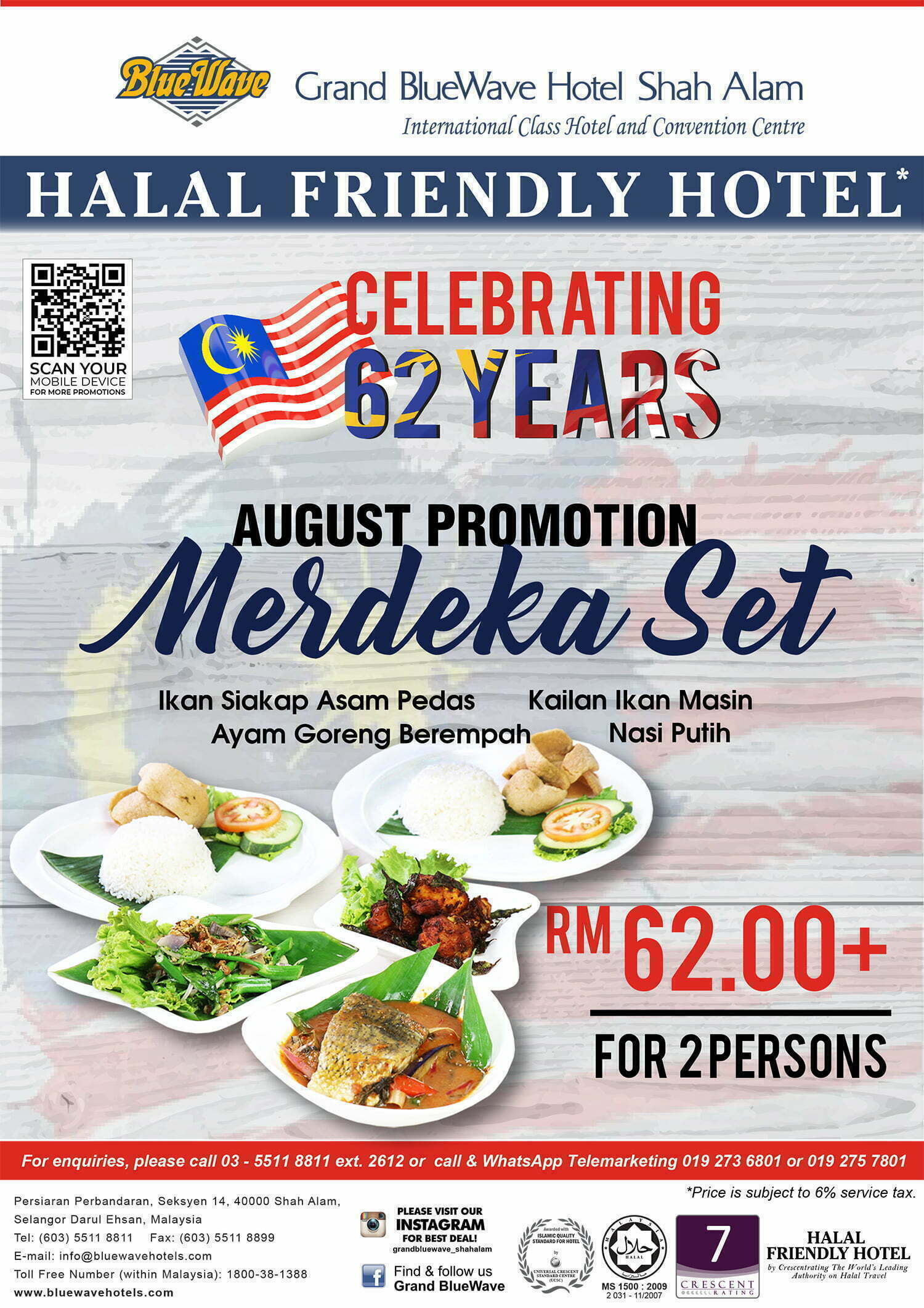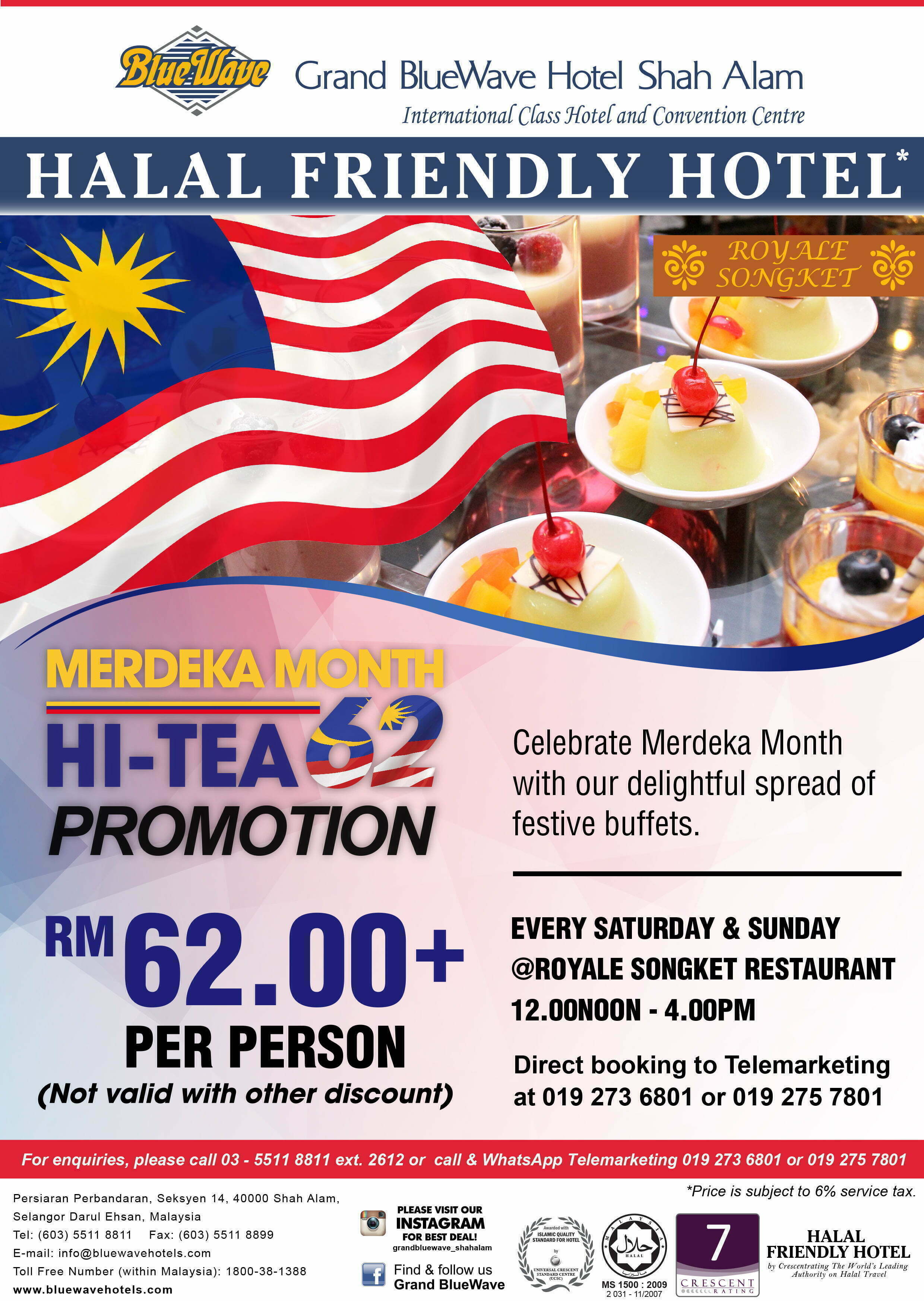 Promosi Makanan Bulan Merdeka Grand BlueWave Hotel Shah Alam| Sempena sambutan Tahun Kemerdekaan yang ke 62 tahun, Grand BlueWave Hotel Shah Alam (GBWHSA) akan menawarkan Promosi Makanan Bulan Merdeka (Ogos) untuk sepanjang bulan Ogos iaitu promosi Hi Tea Bulan Merdeka RM62.00+, promosi Vibrant Rainbow Cake 1 KG RM62.00+ dan Set Merdeka untuk 2 orang RM62.00+.