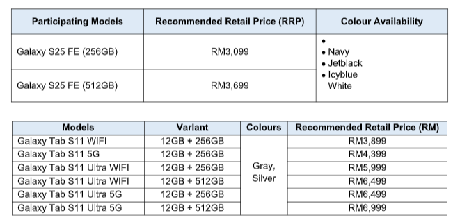 Whether for design, note-taking, or productivity, the Tab S11 series combines sleek portability with the tools to power creativity and everyday tasks anywhere. The Galaxy S25 FE and Galaxy Tab S11 Series will be available starting 19 th September 2025 in Malaysia 2 , with the colour and storage options below: