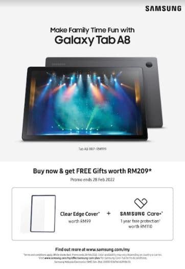 The Galaxy Tab A8 (Wi-Fi 3+32GB) is now available with a Recommended Retail Price of RM999. From today until 28 February 2022, buyers can enjoy two free gifts with purchase.