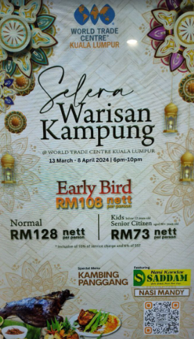Harga asal bufet ramadan “Selera Warisan Kampung” adalah RM128 nett seorang untuk dewasa. RM73 nett seorang untuk kanak-kanak di bawah 12 tahun dan warga emas berumur 60 tahun ke atas. Pembelian boleh dibeli di