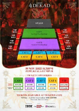 Tiket-tiket dengan harga (early bird) Cat 4 (RM298), Cat 3 (RM398), Cat 2 (198) dan Cat 1 (238) harga biasa (normal) Cat 4 (RM318), Cat 3 (RM418), Cat 2 (218) dan Cat 1 (258) akan dijual mulai Jumaat, 23 September