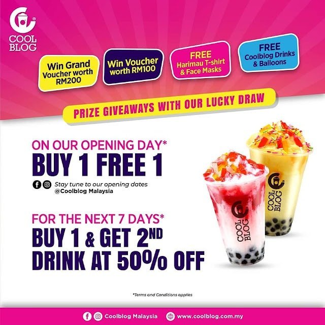 Hadiah yang bakal dimenangi termasuk baucar Coolblog, minuman percuma dan barangan menarik. Untuk tarikh dan maklumat pembukaan cawangan yang akan datang, sila layari