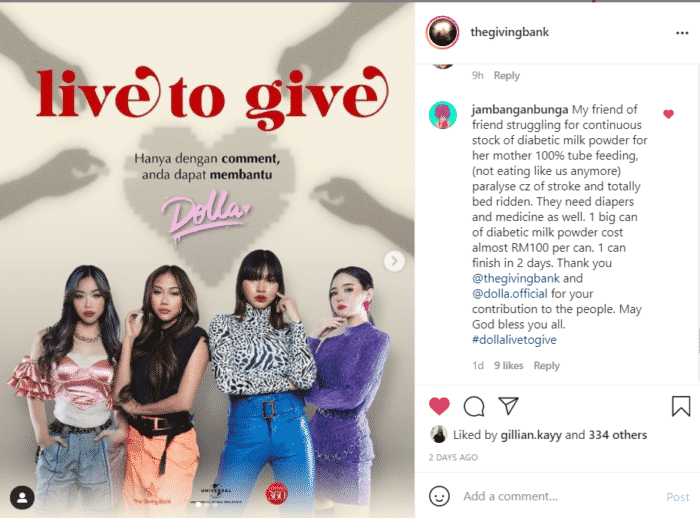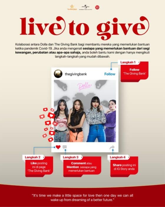 Dikenali sebagai Live to Give kempen bersama The Giving Bank X Dolla. Kempen amal ini dibantu oleh ahli Dolla mempromosikan tujuan program dijalankan. Mencari individu atau mereka yang memerlukan bantuan. Ada yang amat memerlukan tetapi tidak tahu cara atau tempatnya. The Giving Bank X Dolla ini adalah platform untuk mereka merealisasikan perkara ini.