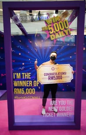 Bermula dari sekarang sehingga 18 September 2022, dua baucar beli-belah bernilai RM 5,000 akan di berikan setiap hari. Diberikan sepanjang tempoh Kempen ‘The Golden Ticket’ di Suria KLCC.