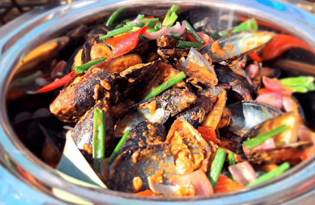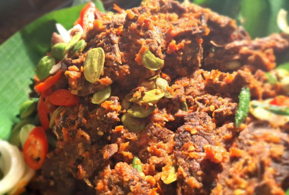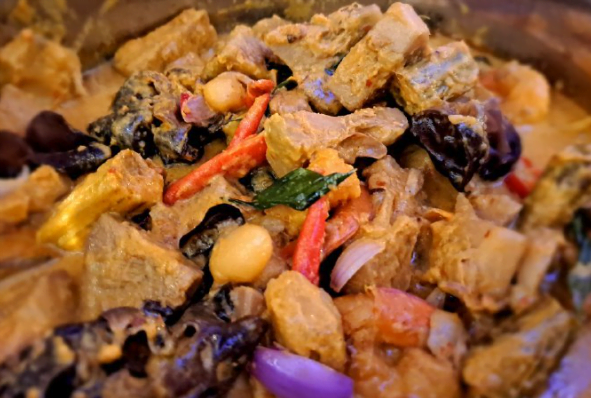Termasuk ayam masak rendang hitam, asam pedas daging tetel tulang rawan, gulai udang nangka muda bersama cendawan.