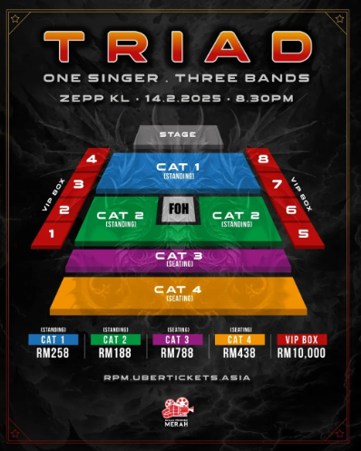 Tiket untuk konsert TRIAD sudah mula dijual 7 Disember lalu dan boleh didapati secara dalam talian menerusi laman web https://rpm.ubertickets.asia/
