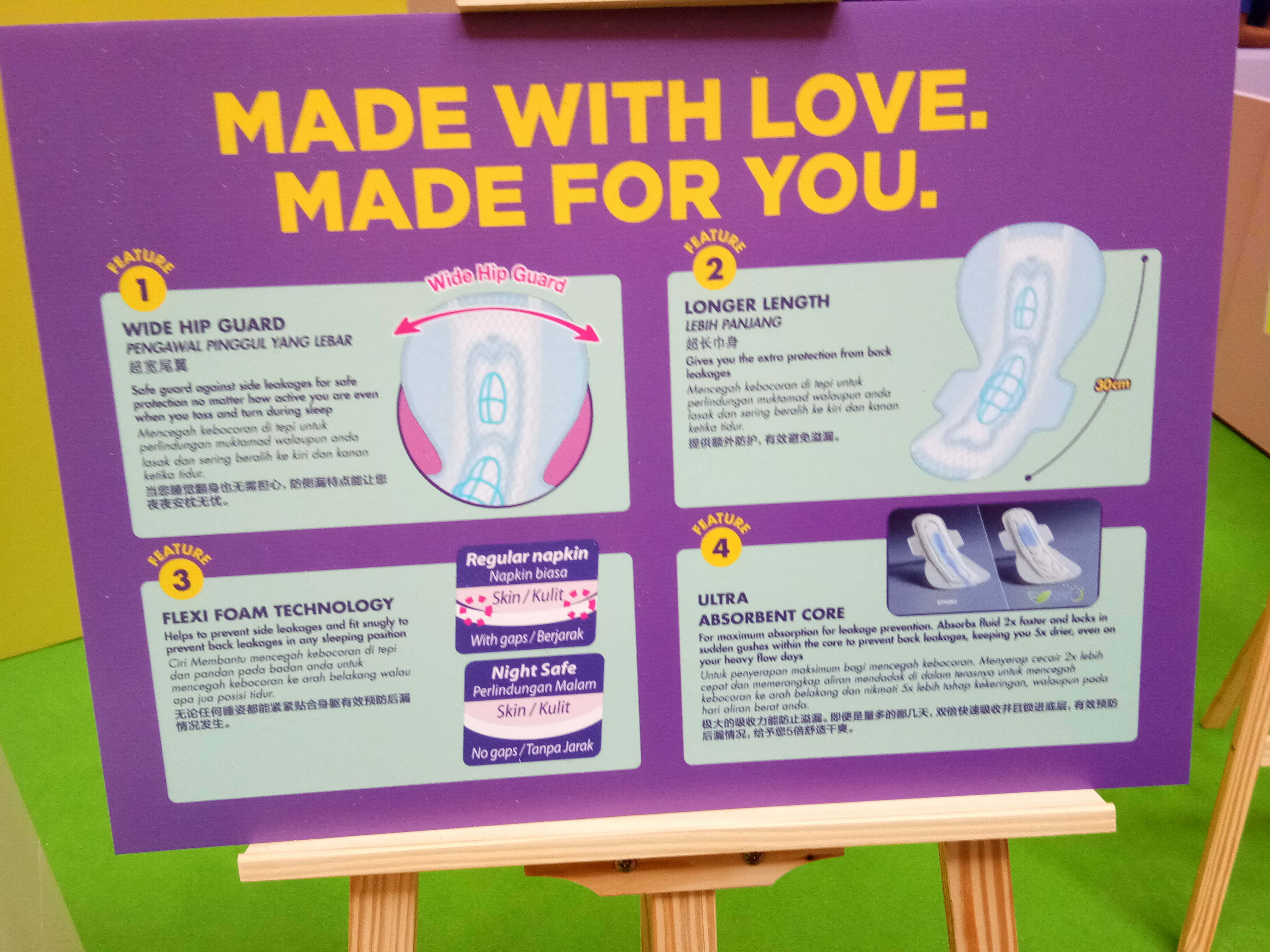 Bungkusan yang diberi nafas baru dan ‘diperbuat dengan penuh perhatian’ atau ‘Made with Love’ ini memperkasakan kehidupan kaum wanita melalui kecanggihan inovasi dari Jepun. Direka dengan mengambil kira keperluan dan kemudahan golongan wanita,tuala wanita Laurier serba baharu mengetengahkan kecanggihan teknologi dan inovasi Jepun, terutama ciri “Ultra Absorbent Core”.