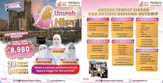 Pakej Umrah Nisa Persada Global Holidays bermula pada harga RM8,980 untuk 4 orang sebilik untuk tempoh musim panas bermula 20 September 2024 sehingga 30 September 2024.