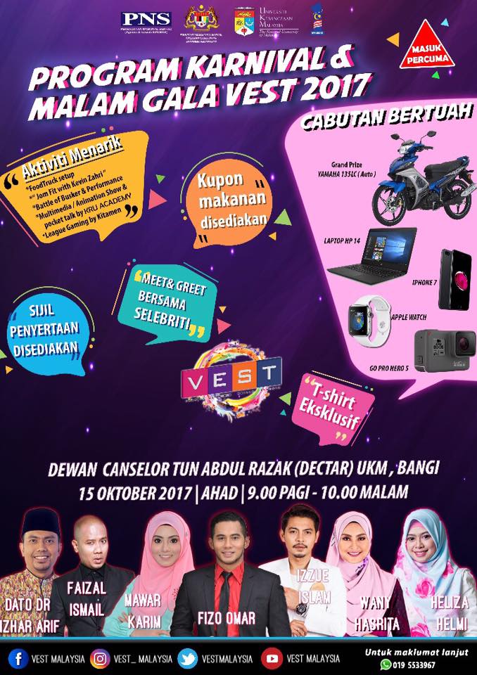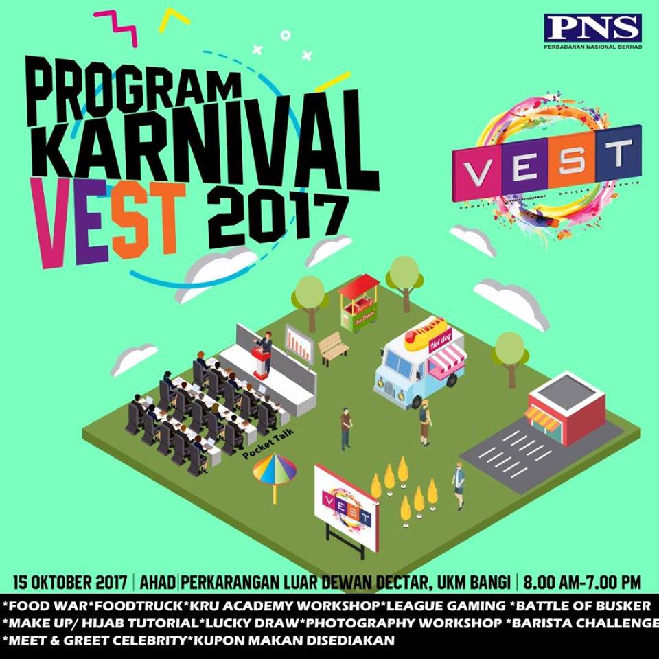 Selesai sahaja 6 bulan kelas intensif , satu karnival telah diadakan untuk mahasiswa yang telah mengambil bahagian. Karnival VEST 2017 telah berlangsung dengan jayanya pada 15 Oktober 2017 di Dewan Dektar, UKM Bangi . Karnival yang penuh dengan aktiviti dari pelbagai bidang seperti Food truck, Food Preneur, KRU workshop, Make Up/Hijab Workshop,League Gaming dimana para pemenang membawa balik PS4 Slim jika mendapat tempat pertama atau kedua. Eh buat mereka yang terer membuat kopi barista challenge juga diadakan . Part yang ini rasanya semua memang setuju bila aktiviti Lucky draw atau lebih dikenali Cabutan bertuah. Mana taknya hadiah utama seperti motor YAMAHA gadjet terkini seperto iPhone 7, Samsung Galaxy Tab, Komputer peribadi ,Kamera, GoPro Hero 4, Apple Watch, Ipod Nano, Ipod Shuffle. Yang lagi menarik jika anda memenangi tiket ke Universal Studio Singapore. Mahu tak menjerit , kegembiraan jika dimenangi kan