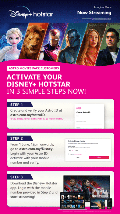 2. Activate (from 1 June 2021):  Customers must visit astro.com.my/Disney, log in with their Astro ID, and key in their mobile number to activate their entitlement.
