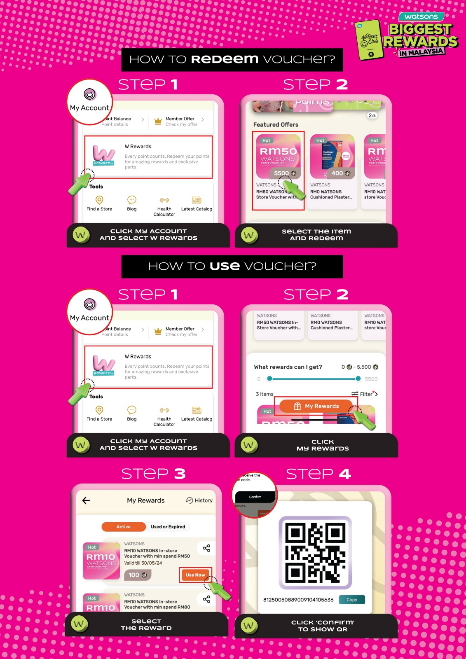 Pengunjung boleh menantikan pelbagai ganjaran menarik di W Rewards Zone, tawaran eksklusif ahli, serta kejutan istimewa.Watsons Malaysia mengalu-alukan rakyat Malaysia untuk menyertai program kesetiaan Watsons Club dengan pelbagai keistimewaan termasuk keahlian seumur hidup.