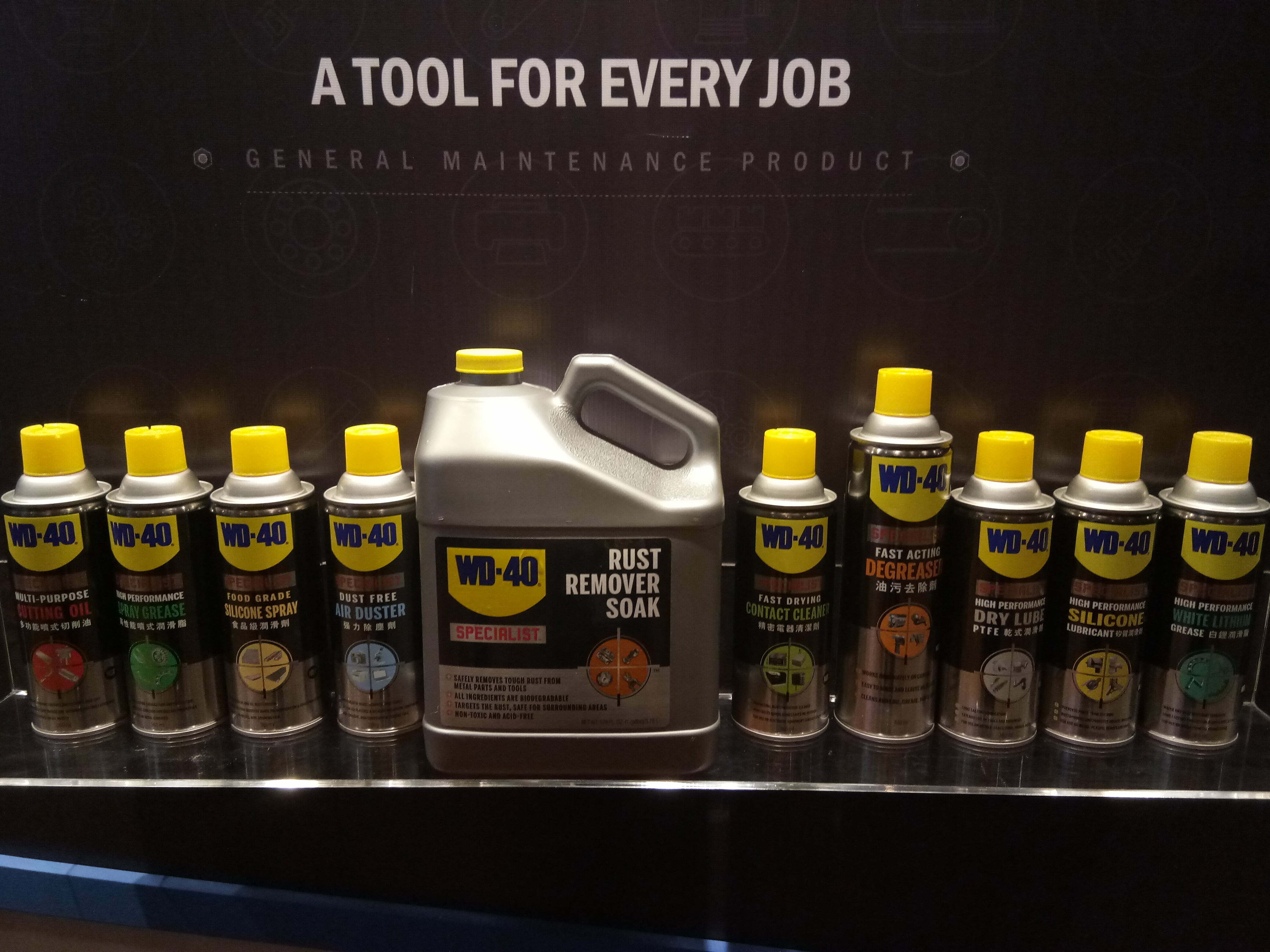 Syarikat WD-40 adalah pembuat produk pelbagai guna yang sangat dipercayai, malah peralatan ini mesti ada dalam toolbox setiap rumah seluruh dunia. Jenama Amerika ini ditubuhkan pada 1953 sebagai anti karat, pelindung anti-corrosian untuk lapisan luar Atlas Missile (peluru berpandu) dan ia diubah kepada produk penyelesaian yang pantas bagi membersih dan melindungi, melonggarkan bahagian yang berkarat, mengusir kelembapan dan lain-lain.