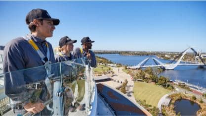 The Matagarup Bridge Zip + Climb. Visitors can climb the 314 steps to reach the bridge’s 72-metre-high Sky View platform – offering stunning 360-degree views over the city, Swan River and Optus Stadium.